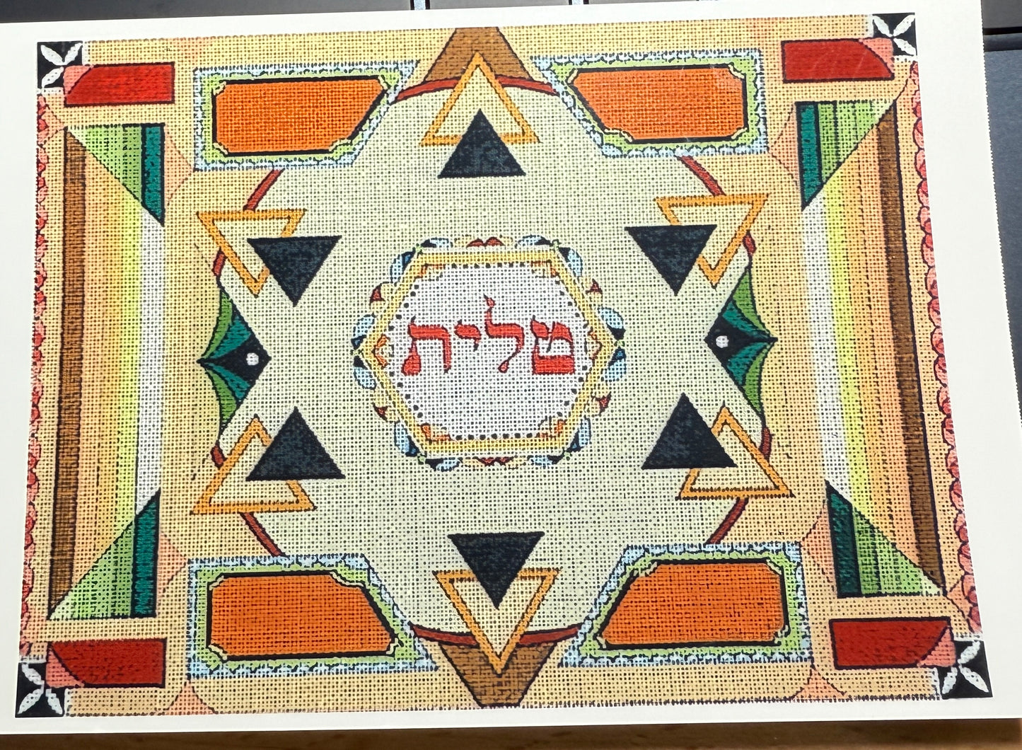 Tallit with great stitches and colors. This comes with a stitch guide. We can always change the colors. Great geometric canvas.