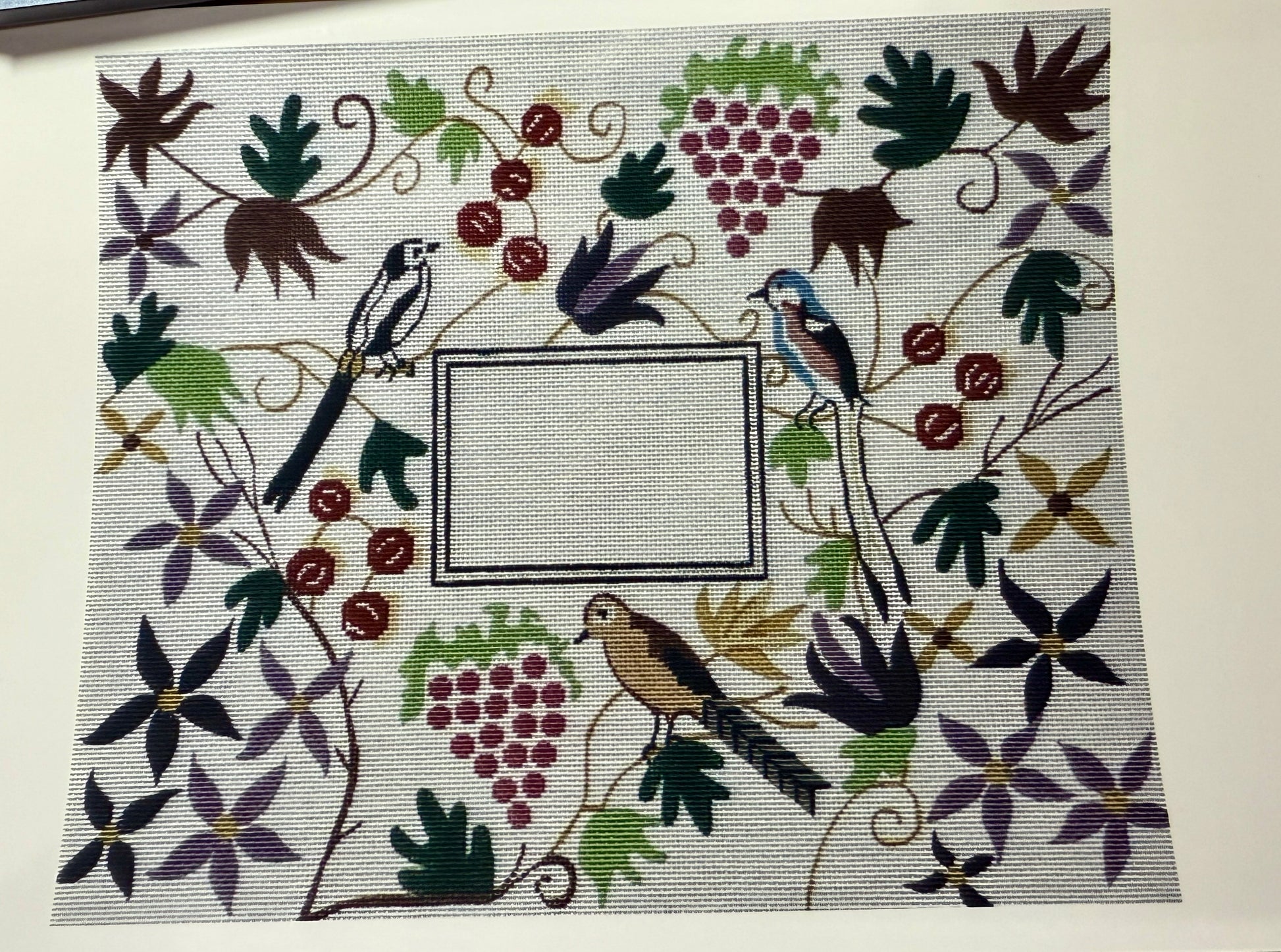 Very different style of Challah cover. This has berries and birds and trees on it. It would be great to stitch.