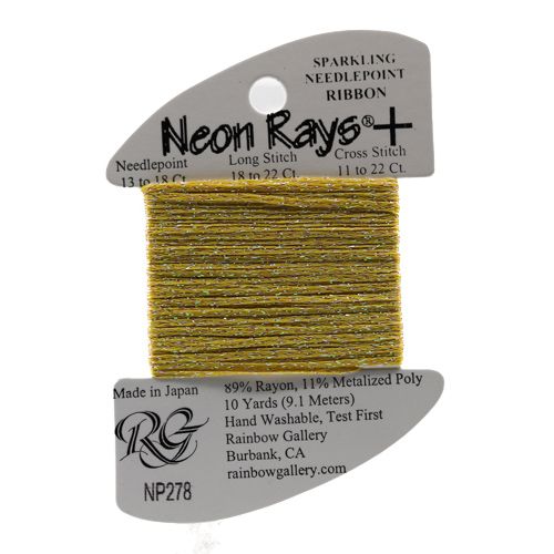 Add just a little more sparkle to your stitching. Neon Rays+ is a wonderful rayon ribbon with a metallic sparkle to it. It comes on a 10 yard card and is perfect for canvases that are 14-18 count in needlepoint and cross-stitch.