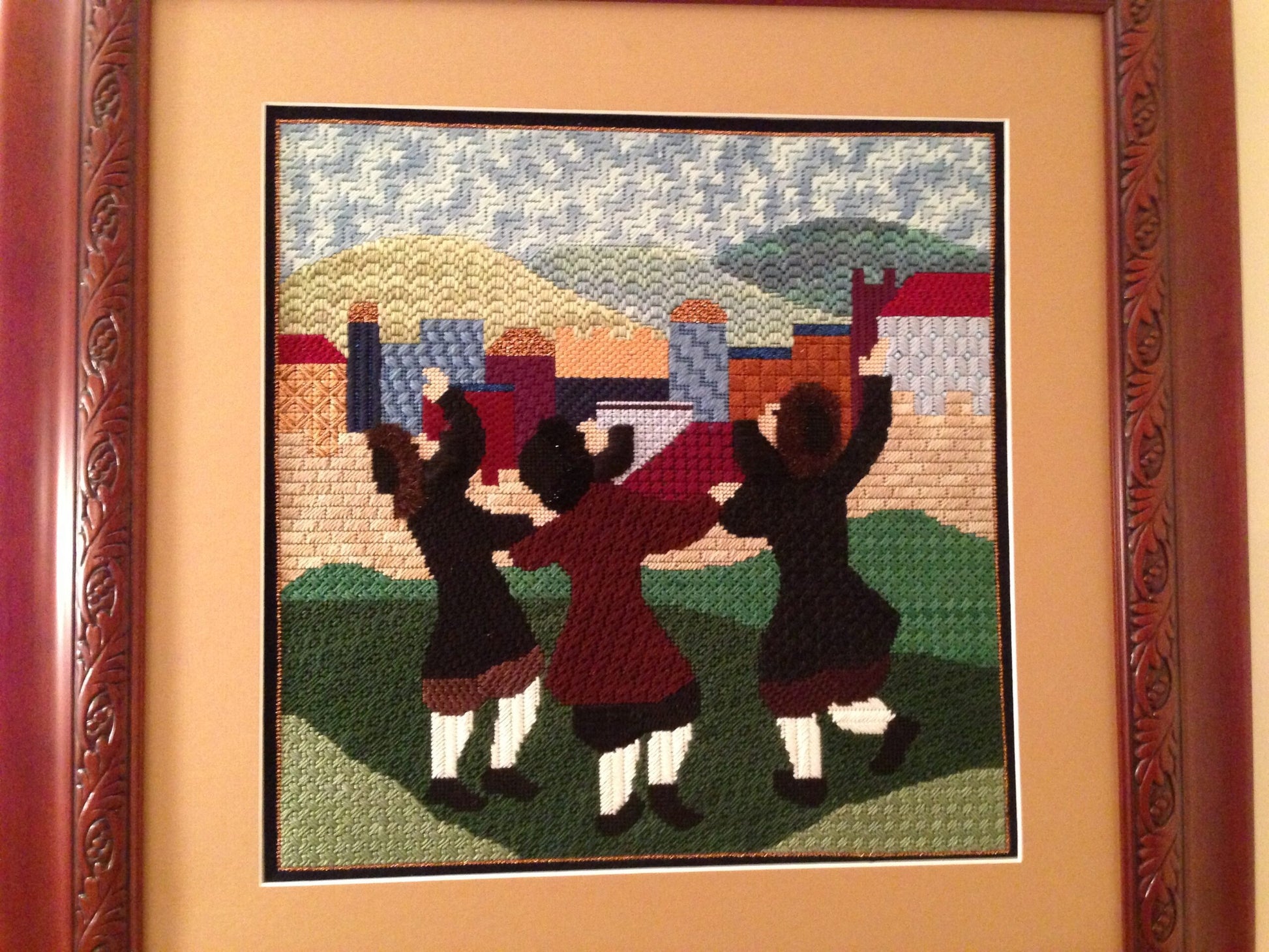 Dancing Chassidim Tallit. Great for a picture or a tallit. A stitch guide from Renee Seidman is available.
