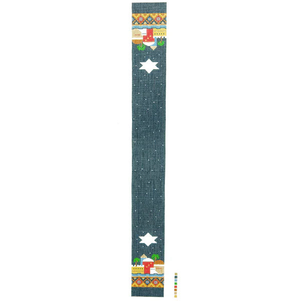 Needlepoint canvas with a picture of Jerusalem at night. Has matching tallit and kippa.