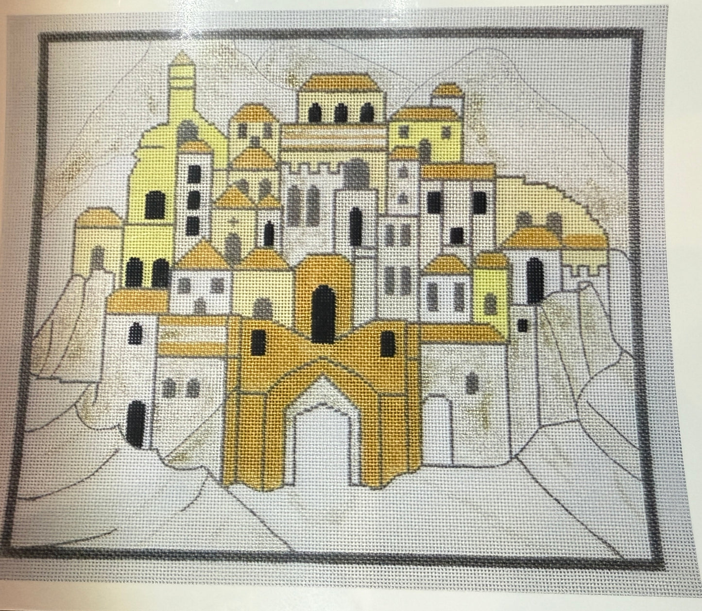 Great canvas of Jerusalem in golds and whites. We have this hand painted and printed. Looks great done both ways. Come in and we will add different stitches to this canvas.
