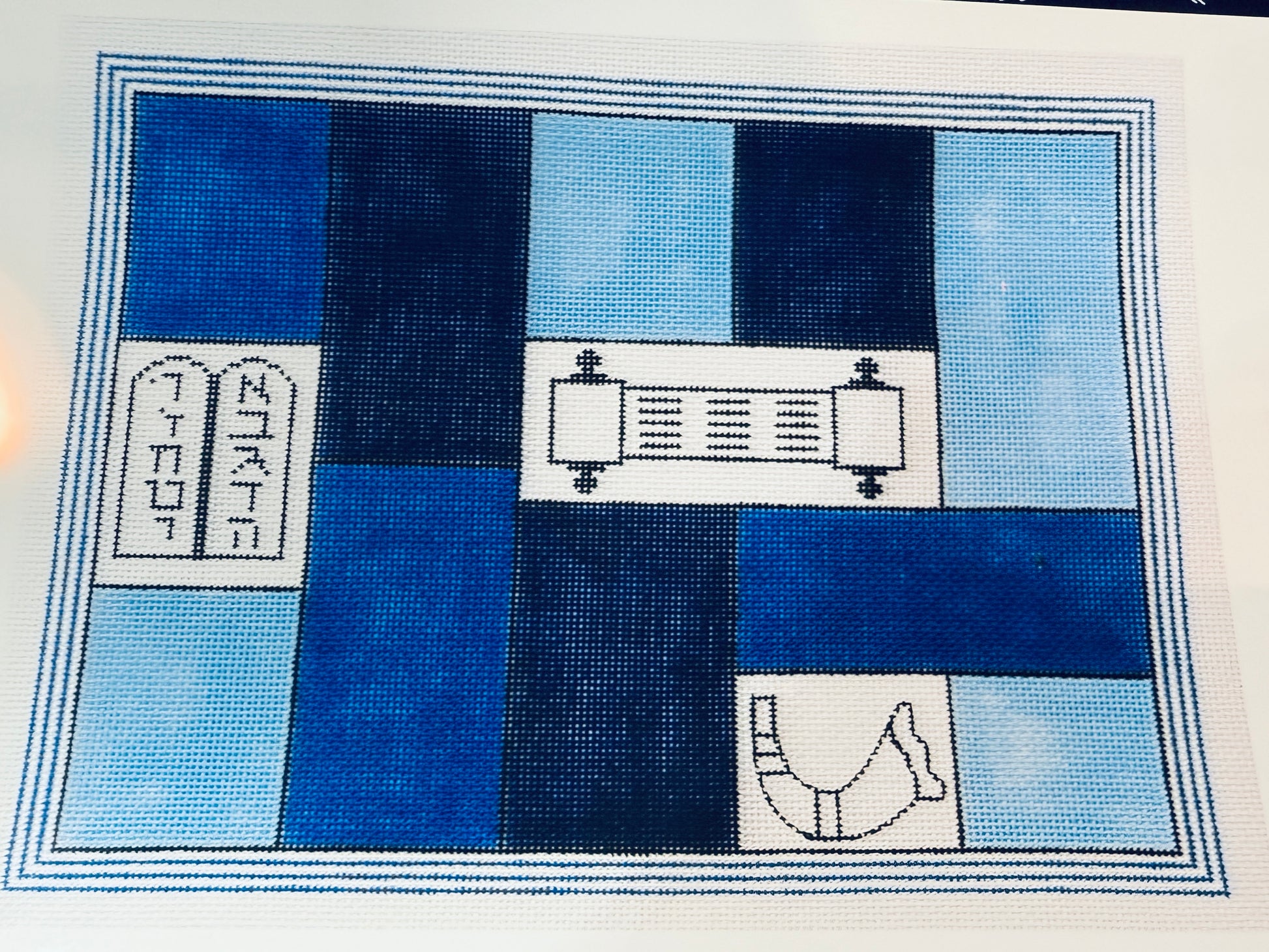Great tefillin with traditional Judaic symbols. It includes geometric areas for fun stitches. All in traditional blues.