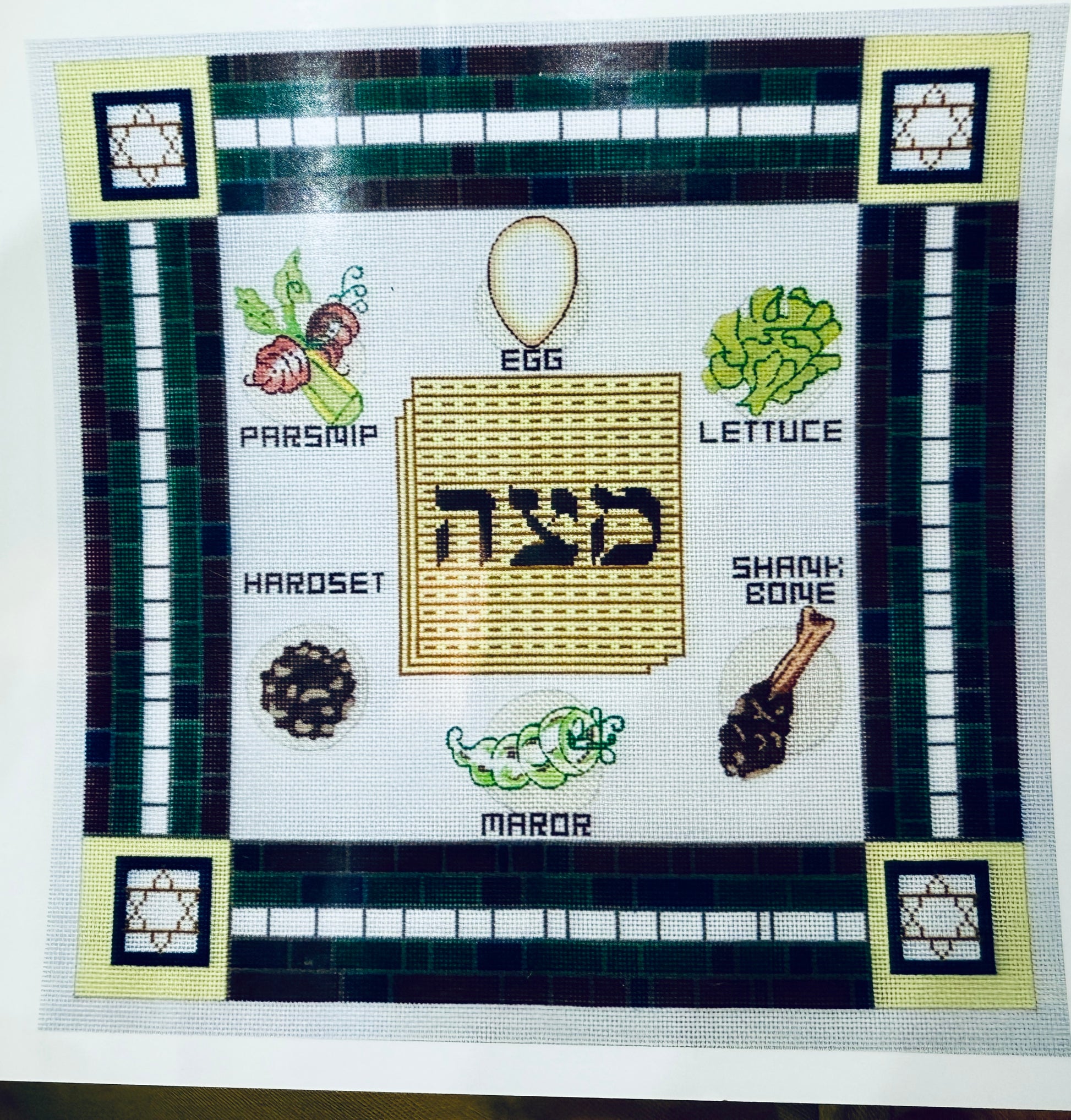Passover Matzoh Cover #1. Artistic depiction of items on the Seder Plate with stunning border art.
