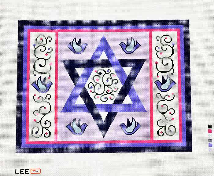 Needlepoint canvas with a purple background, doves and a Star of David. A great canvas for a girl's tallit bag or a picture. This has a matching tallit.