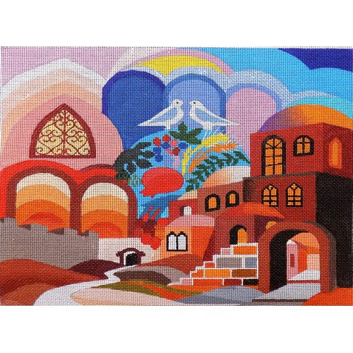 Bracha Lavee is an artist from Israel who paints the skies and city of Jerusalem. This canvas has the seven species on the canvas celebrating Judaism.