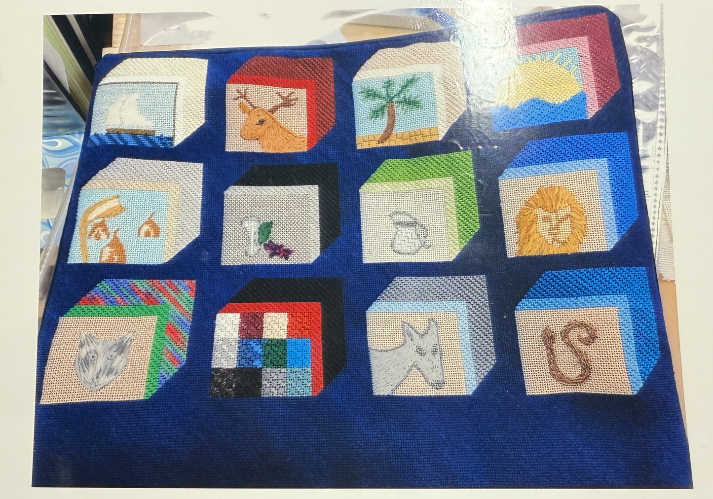 Painted by Renee Seidman this tallit has all the 12 tribes depicted. Images of their colors and symbols that represent them. There is a stitch guide that comes with this canvas. It would make a wonderful picture on a wall. Comes in 18 count.