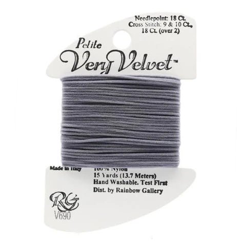 One of our most popular threads, very velvet is a fuzzy, beautiful velour yarn. It maintains its shape and thickness throughout its length. The texture is different from other threads and give stitches a distinctive look. It is a 100% nylon fiber that feels like velvet. 15 yards per card. Great on 13 or 14 count canvas.