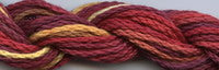 100% Pima cotton. Three stranded. Perfect for those straight stitches such as Bargello, even on 14 count canvas. One ply is equivalent to size #5 pearl cotton. 10 yards per skein (equal to 30 yards of pearl cotton). These fibers are hand-painted and permanent. They are dyed in small amounts so each batch will vary in distribution of color and in intensity. While this adds character to the fiber, it is advisable to purchase enough thread for a large project at one time.